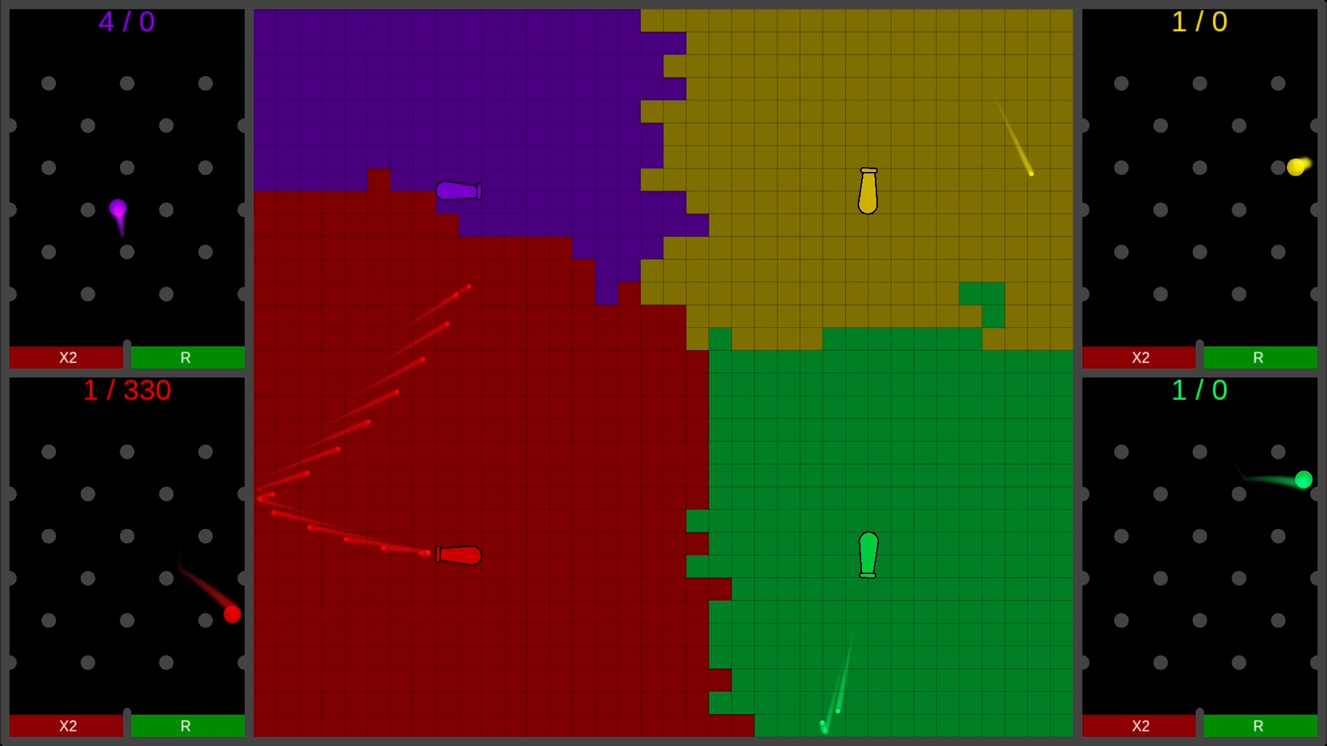 This Physion simulation brings the Multiply or Release concept to life with four competing teams (red, yellow, green, and blue) battling for territorial dominance. Each team controls a constantly rotating cannon positioned in the center of their colored territory. As marbles fall through individual Plinko boards, they accumulate ammunition through the multiply zones or trigger attacks through the release zones.